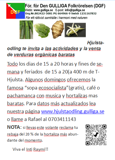 Nu på lördag den 04 oktober 2025 finns i Hjulsta ekoodling från kl 12 till 19 har vi möjlighet att njuta av Bolivianska maträtter såsom: ”Sopa de mani”, ”Chicharron” och ”vegan sallad”. I maten ingår bl.a. potatis, jordnötter, potatis, fläsk kött, majs, olika grönsaker(en del ekologiska producerade i vår odlings plats)